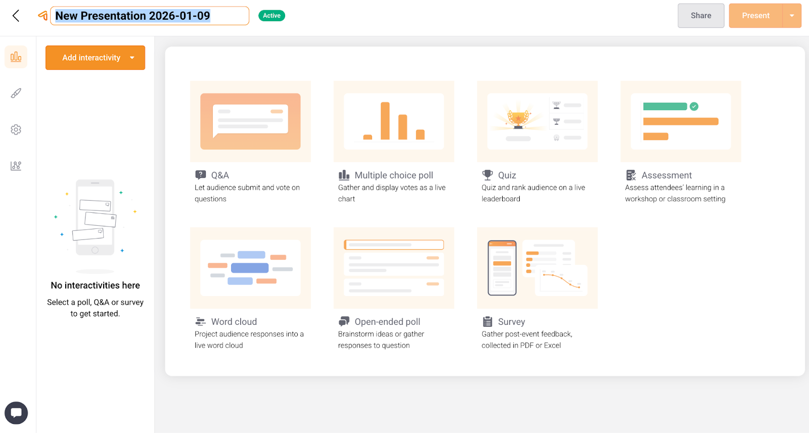 Tip: You can reorder Interactivities by dragging them up or down in the left sidebar.A Presentation with cards for several interactivities in the Presentation Table of Contents on the left