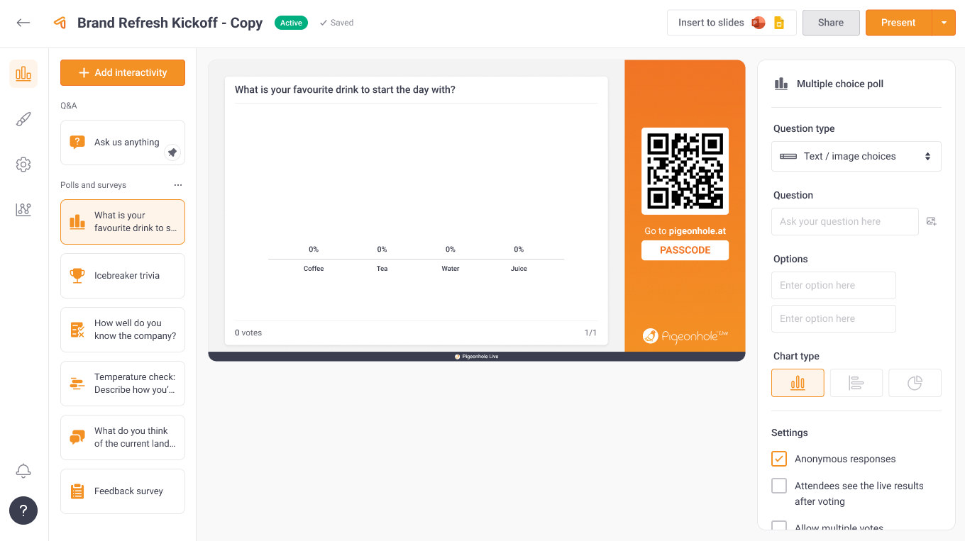 - Participants: Displays a link and QR code that opens the Presentation Pigeonhole in the Audience Web App.