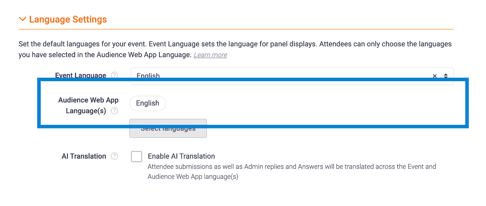 If AI Translation is enabled, then the Event Language would be the default language used on the Panels. For example, if the Event Language is English while an attendee submits a question that is in Spanish, then the question will be translated to English and displayed on the Projector Panel, Admin Panel etc. in English.