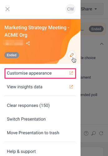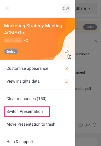 - (Recommended) Test the Presentation Pigeonhole. A test enables you to see how participants will experience it in the Audience Web App. If you’re on a paid plan, you can clear your own responses after you complete testing. Hover over the card for the Interactivity and select the “More options” menu (…) > Clear responses.