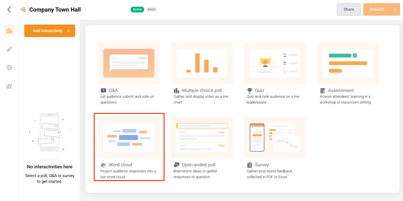 If the Word cloud is the first Interactivity you’re adding to the Presentation, select the Word cloud card.