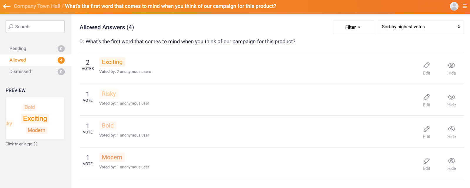 When Answer Filtering is enabled, all submitted responses display in the Pending tab. Answers that the admins allow move to the Allowed tab and are published to the Word Cloud in the Audience Web App. Answers that admins dismissed move to the Dismissed tab and do not appear in the Word Cloud.