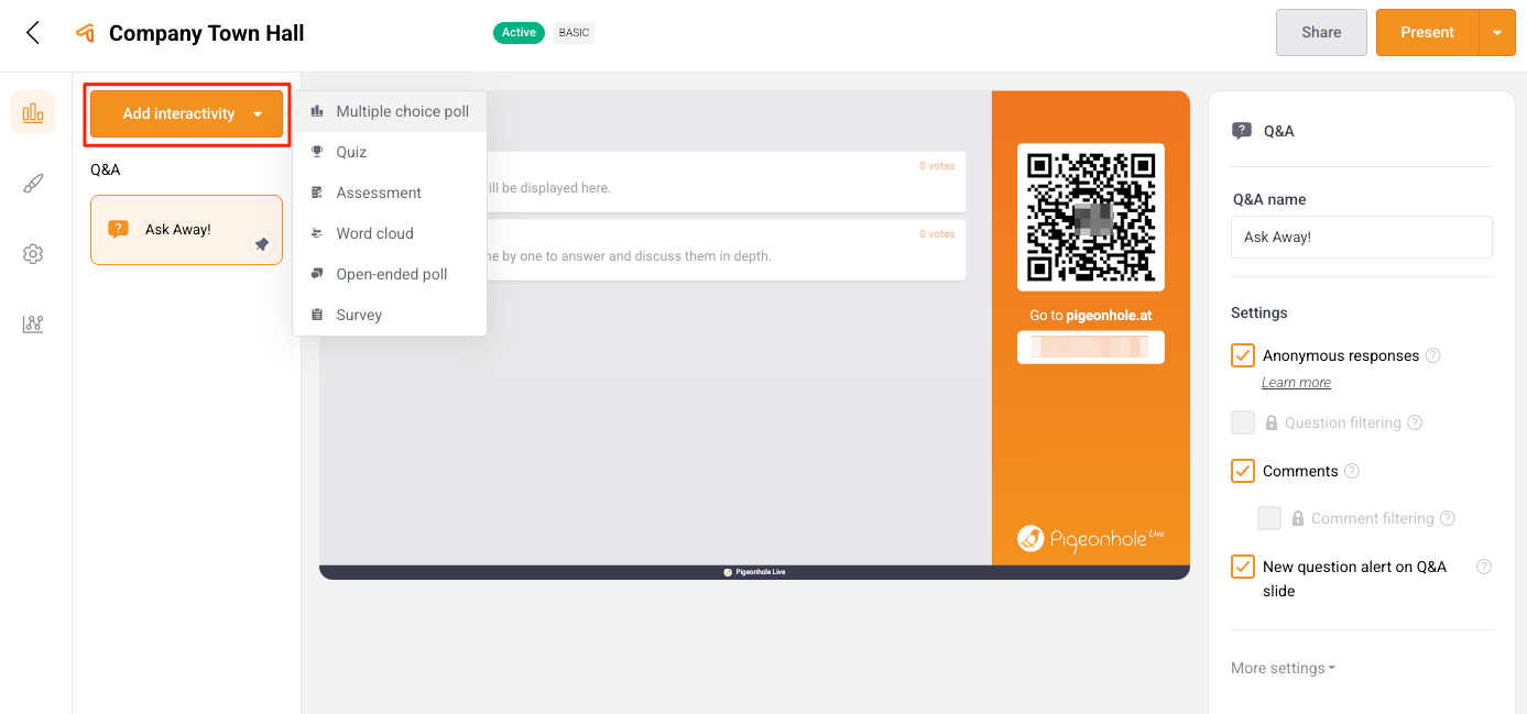 The “Add interactivity to presentation” page for a new Presentation. It shows the cards for all the Interactivity types.