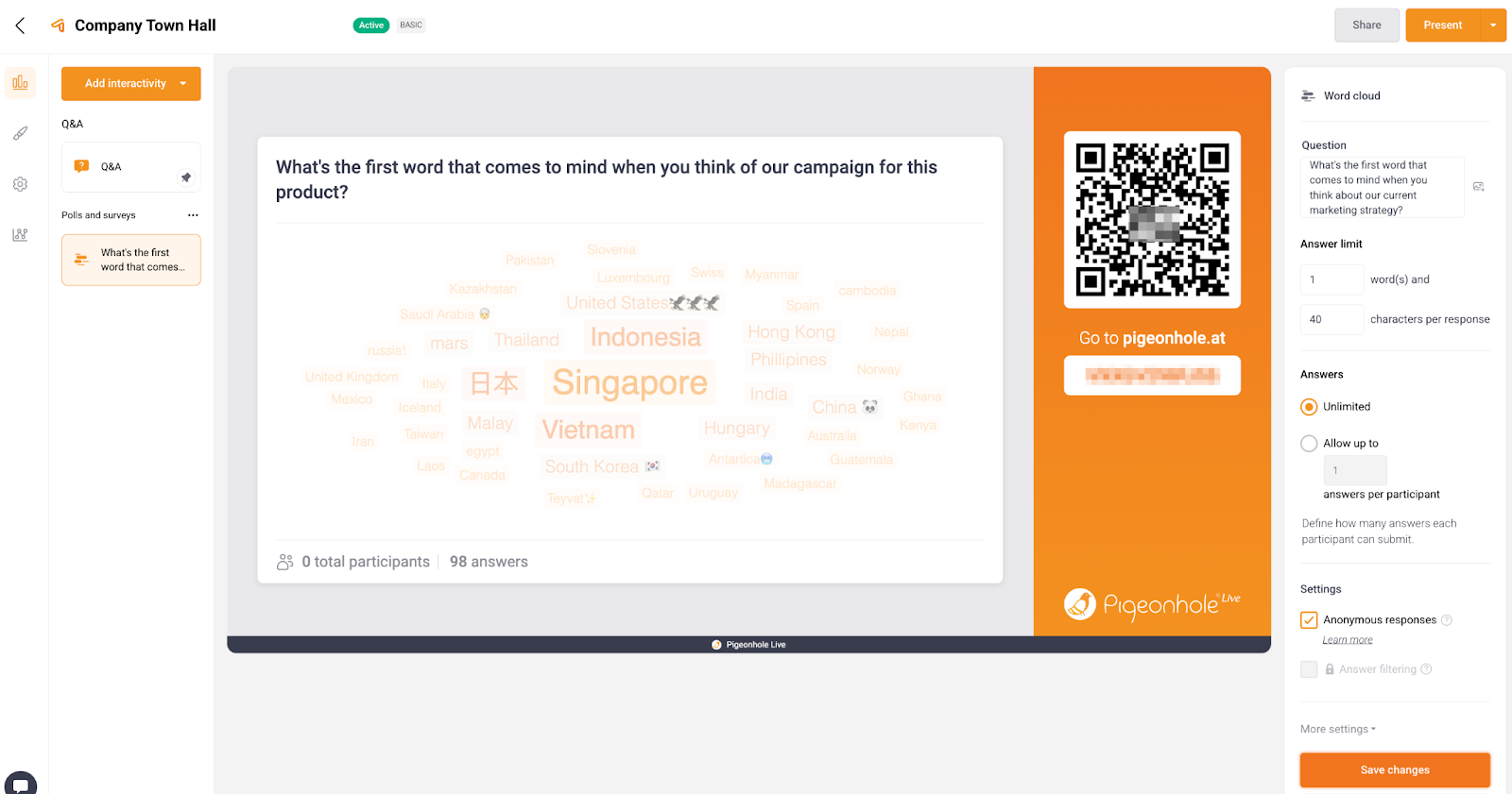 A screenshot of a populated Word cloud in the Audience Web App, including the field for entering a new answer. The Anonymous answers setting is enabled, as indicated by the placeholder text “Enter your answer here as Anonymous…”