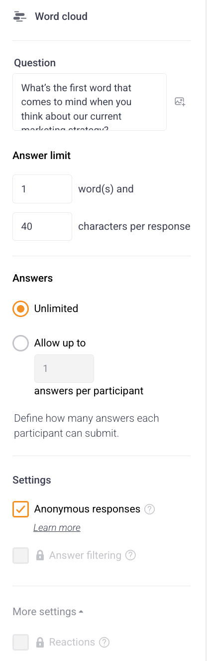 - (Optional) To ensure your Word cloud remains readable, responses are limited to a maximum of 1 word and 40 characters. These are the default settings, but you can further restrict these limits in the Answer limit section to keep submissions even shorter.