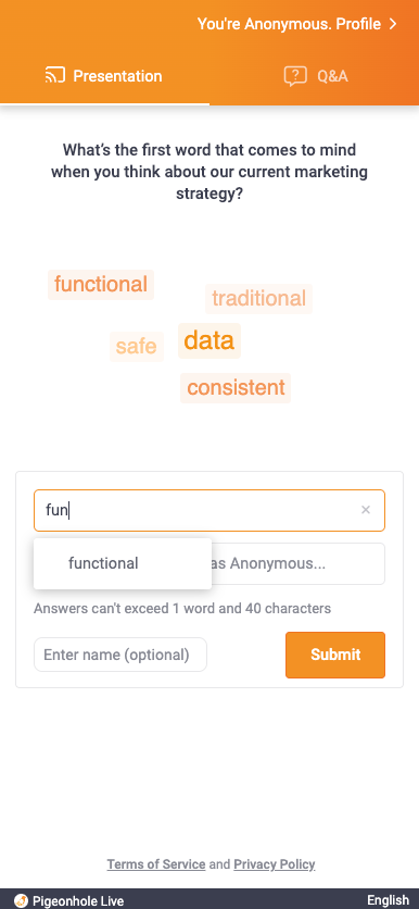 Using the Audience Web App, participants can submit answers and watch the Word Cloud update live.