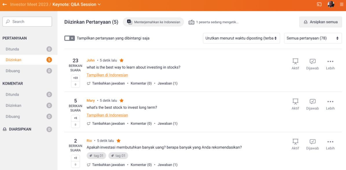 Example of a Q&A session with Bahasa Indonesia as the Event Language on the Admin Panel