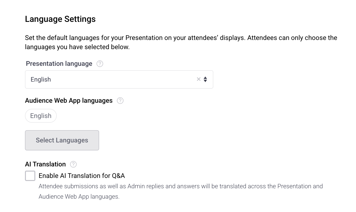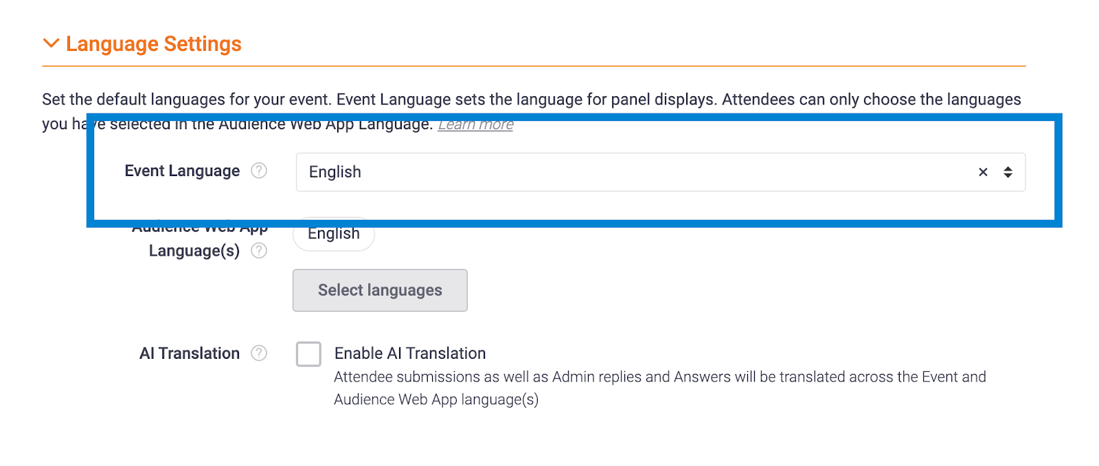 If AI Translation is enabled, then the Event Language would be the default language used on the Panels. For example, if the Event Language is English while an attendee submits a question that is in Spanish, then the question will be translated to English and displayed on the Projector Panel, Admin Panel etc. in English.