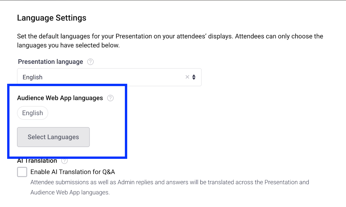 Presenters can select the language(s) that is available for translation on the Audience Web App. For example, if a presentation has attendees that will use English, Swedish, and Thai, the presenter can select the 3 languages, and their audience members would be able to select the language that they prefer on their own devices.