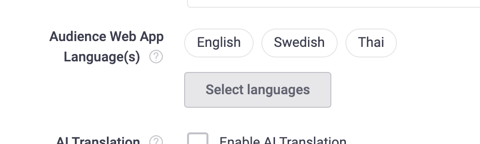 Organisers can select the language(s) that is available for translation on the Audience Web App. For example, if an event has attendees that will use English, Swedish, and Thai, the organiser can select the 3 languages, and their audience members would be able to select the language that they prefer on their own devices.