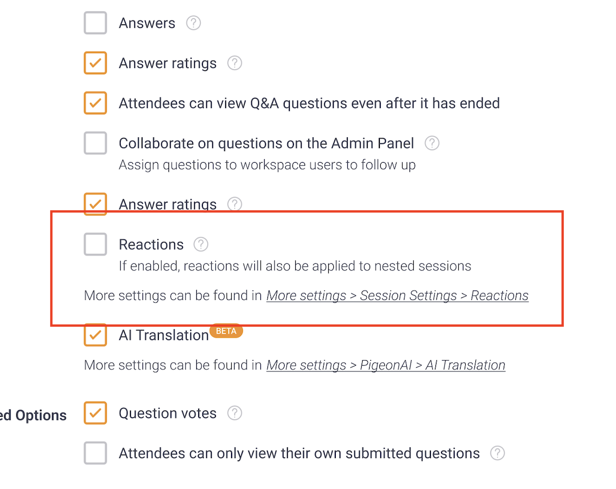 Under a parent session’s settings, check Reactions to enable Reactions for all sessions in the group.
