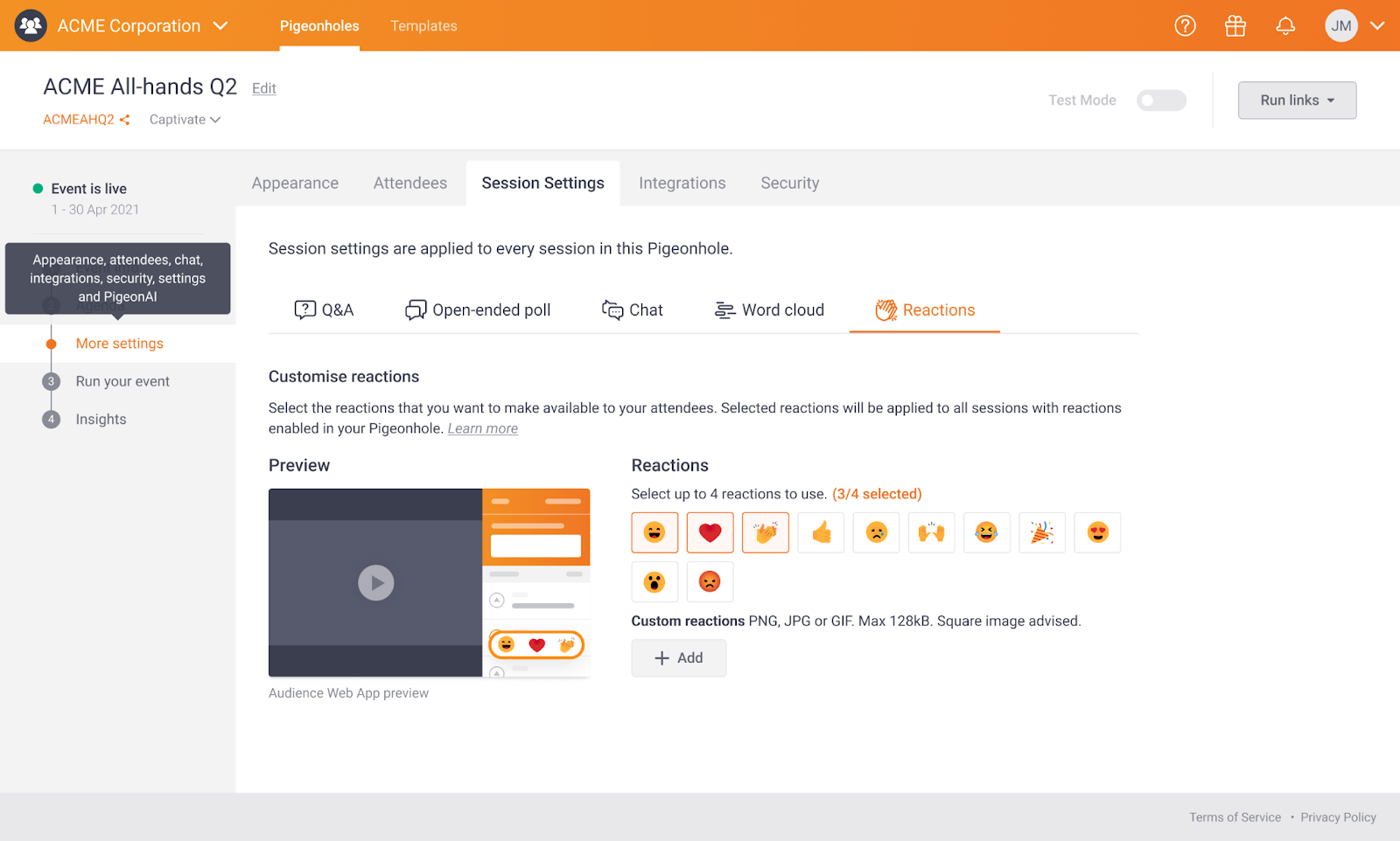 A range of emoji Reactions are available for selection, as well as the ability to upload customised reactions. For example, you could upload your organisation’s logo to make an event more on-brand.