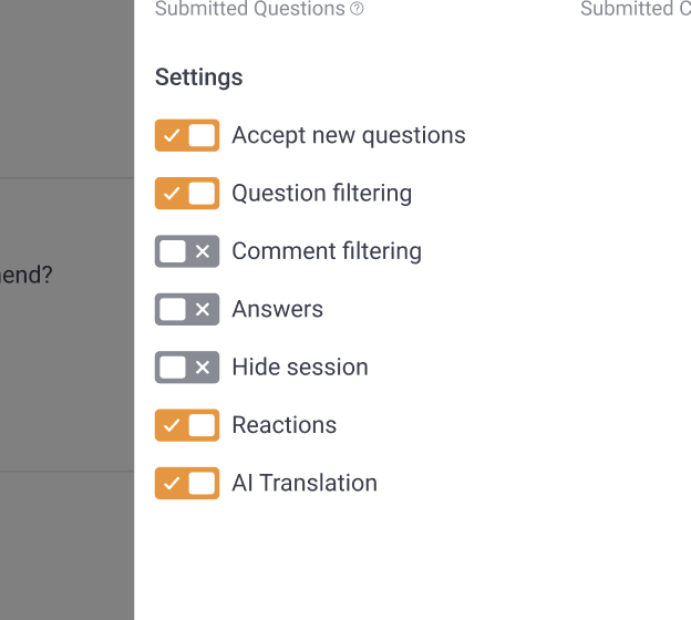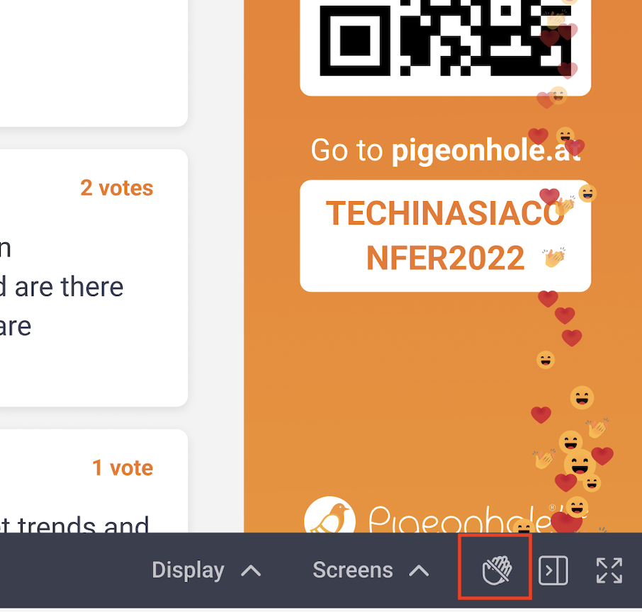 For sessions with Reactions enabled, Admins can control Reactions animation appearance for a Projector Panel via Admin Projector Panel Controls. Audience members would still be able to react on their Audience Web App, but the Reactions will not be visible on the Projector Panel.