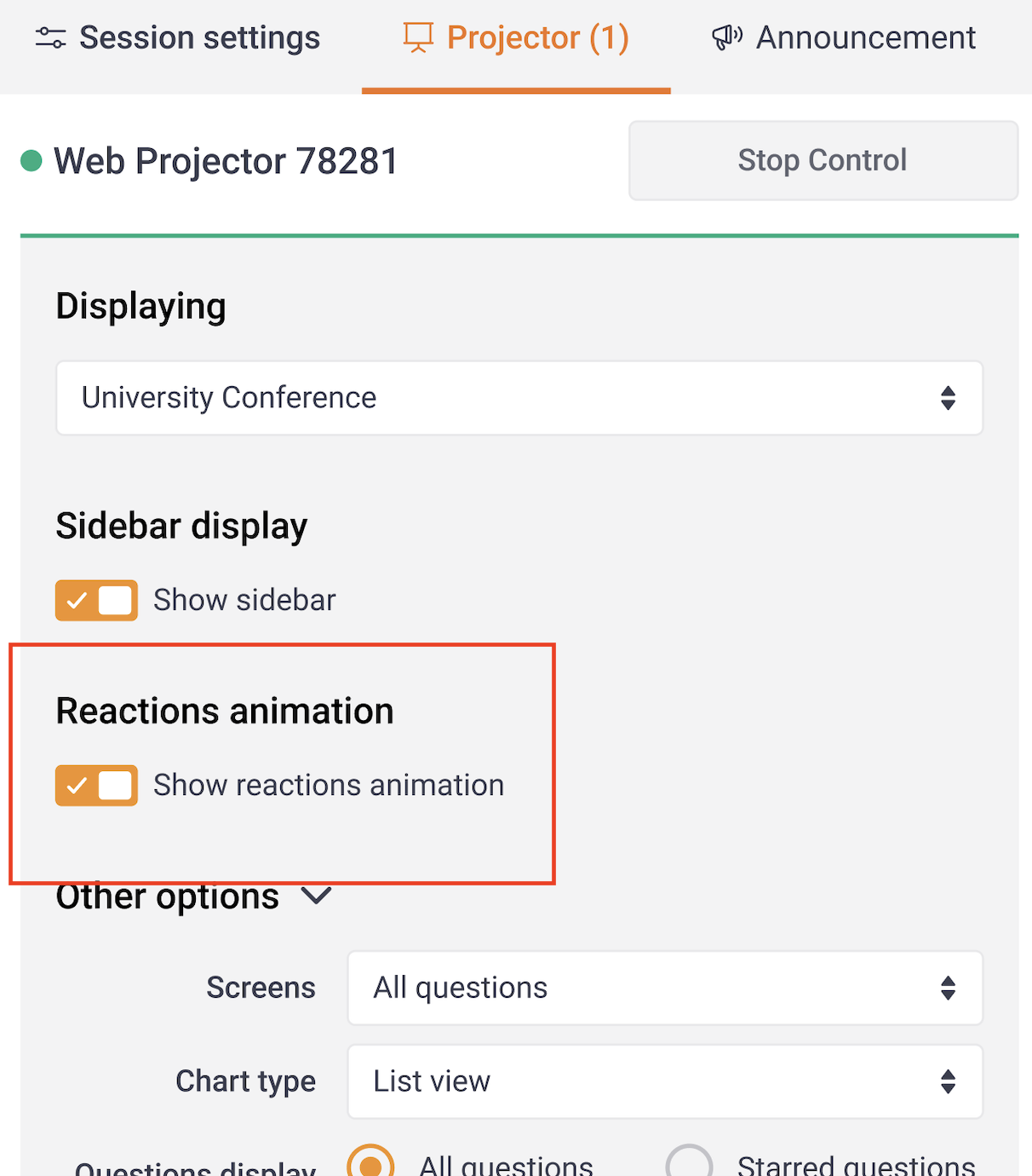 Presenters can also show or hide Reactions animation on the projector panel via the Reactions toggle.