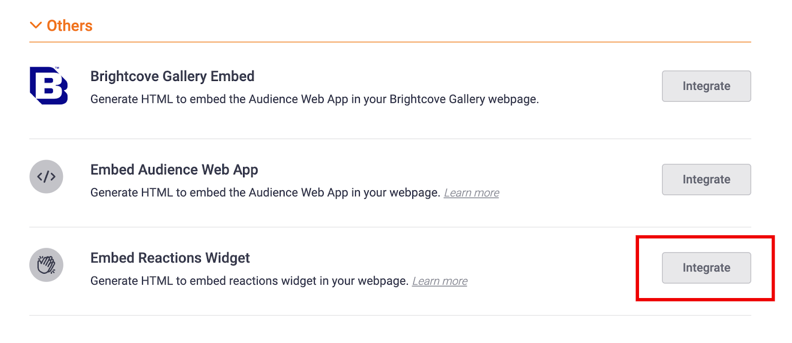 - In your Pigeonhole, click on More Settings> Integrations, then click to Integrate on Embed Reactions Widget.