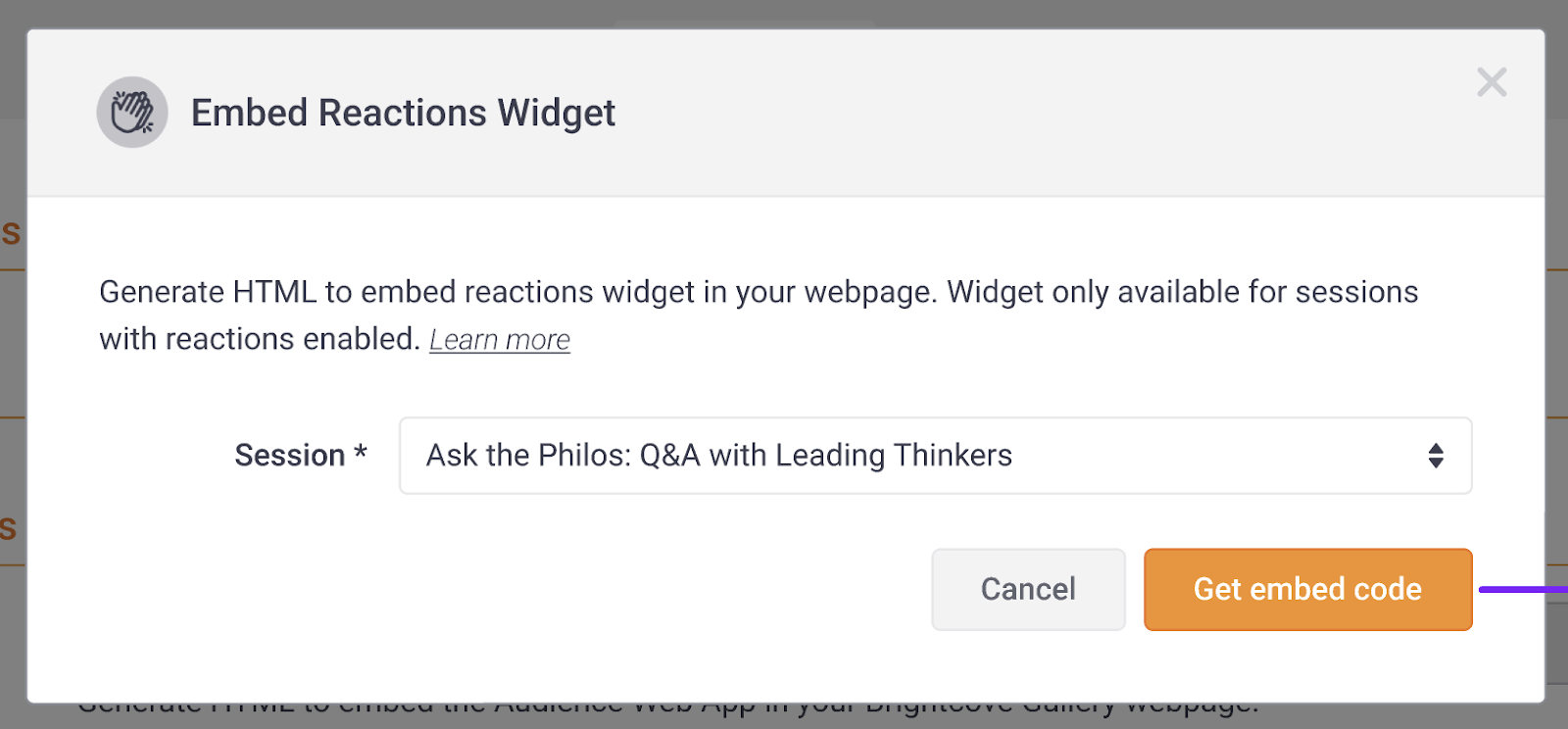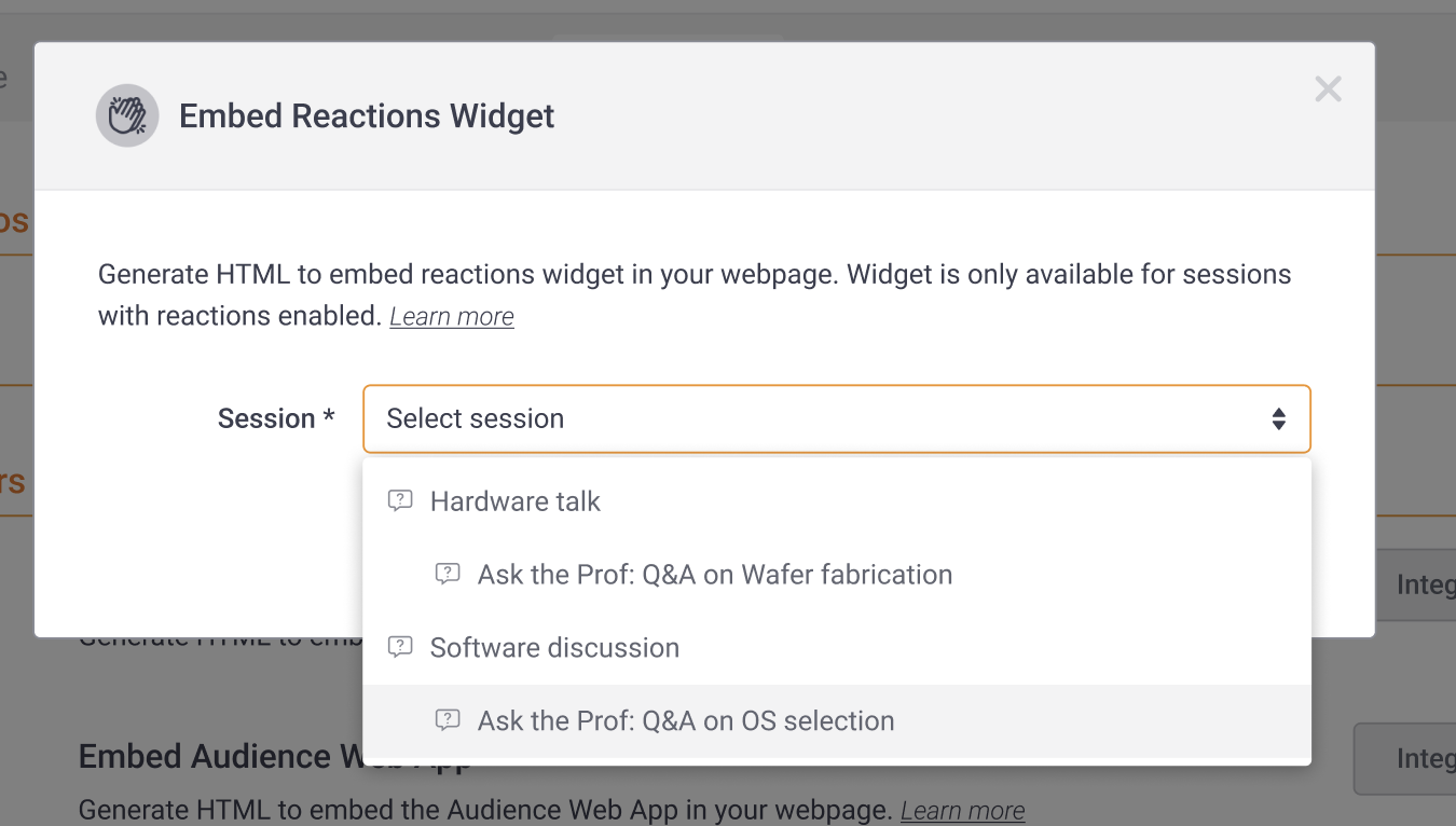 If you are using a website or external platform where you engage attendees, and you want to have your Pigeonhole session’s reactions widget as a standalone item outside of the Audience Web App, you can embed the reactions widget onto your platform by generating an embed code.