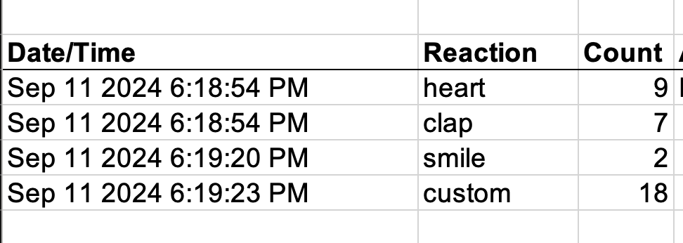 Reactions data are stored in the parent session of each session-group, and tracked by time (listed in the excel sheet export). This allows Organisers to take a closer look at the moments that resonate more with audience members.