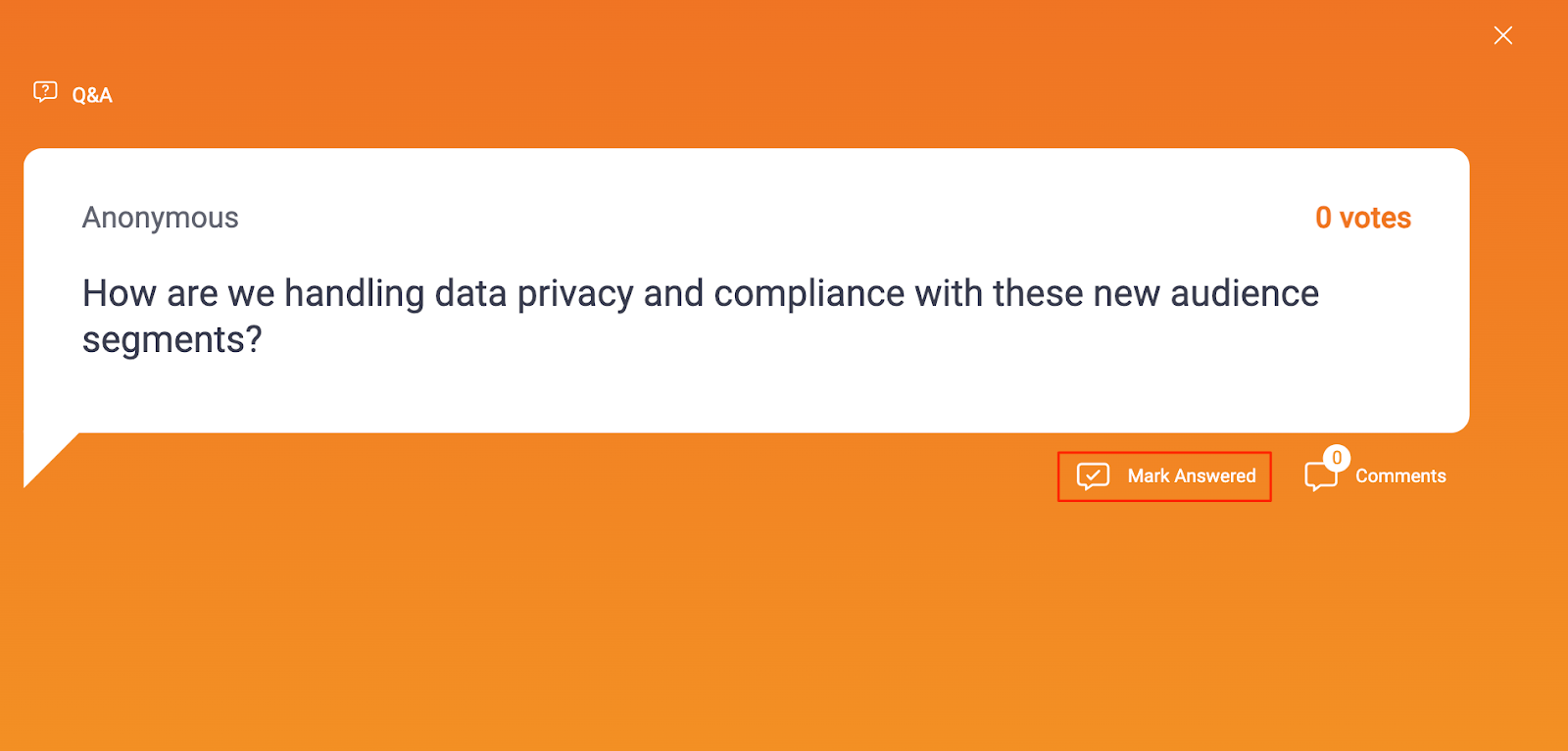 When the question has been answered, select the Mark Answered button. This action removes the question from the Projector Panel. The question remains visible in the Audience Web App. An “Answered” label displays under the question.