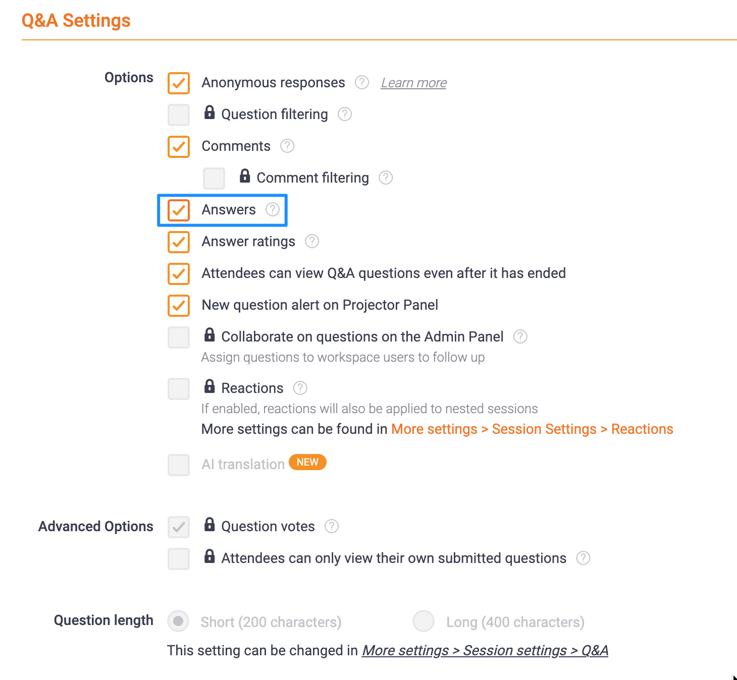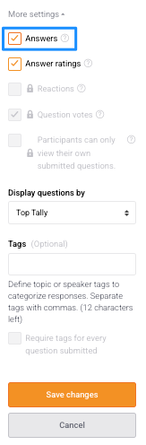 A screenshot of the Q&A Settings area. The Answers option is checked and highlighted.