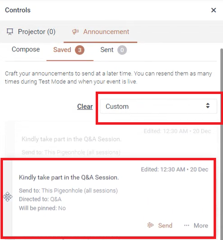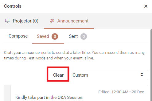 If you have several announcements to send during your event, you can create and save your announcements ahead of the event and send them out on the event day.
