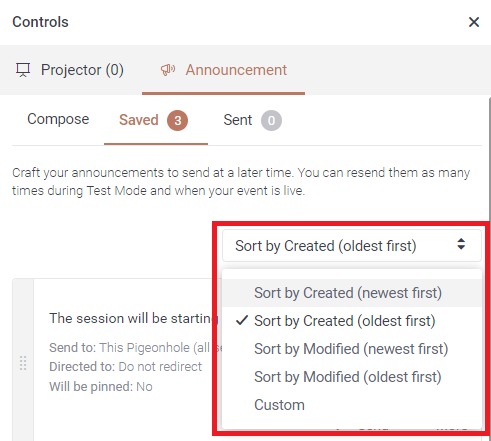 Organisers can reorder saved announcements manually or by pre-set sort orders. This is useful for organisers who have created saved announcements before the event day that may need to add additional information or adjust the sequence of pre-saved messages. It can also be helpful if more than one Admin is making changes to an event. Pre-sort options allow users to sort through recent changes or newly created announcements quickly to allow any user to quickly sort through recent changes or newly created announcements.